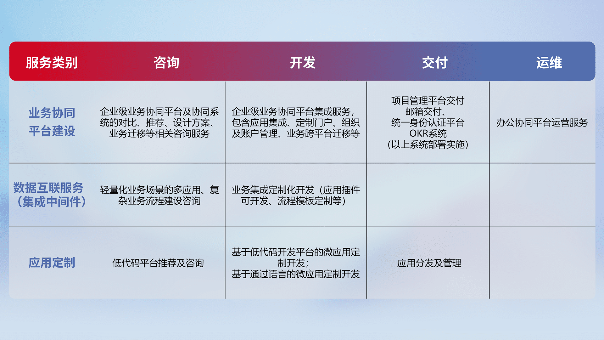 针对钉钉、、企微、、IDaas等平台级产品提供产品的规划、、、方案、、、、交付、、、、定制化开发等服务,,实现如统一协同办公、、智能客户服务、、、、混合会议管理、、智能数据查询、、等业务场景,,,,实现数字化转型。。
